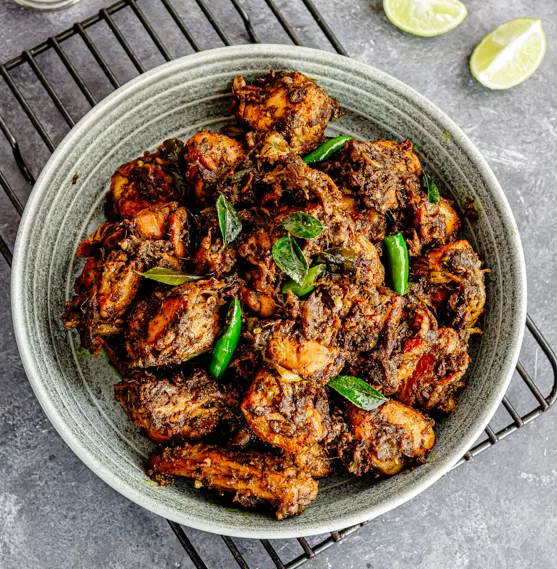 Spicy stir-fried chicken tossed with black pepper, curry leaves, and aromatic