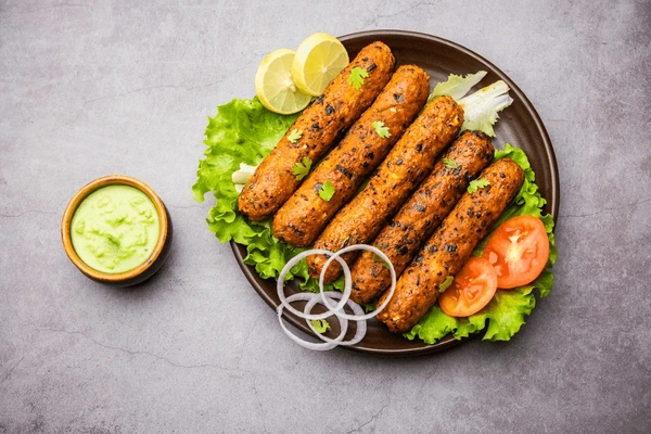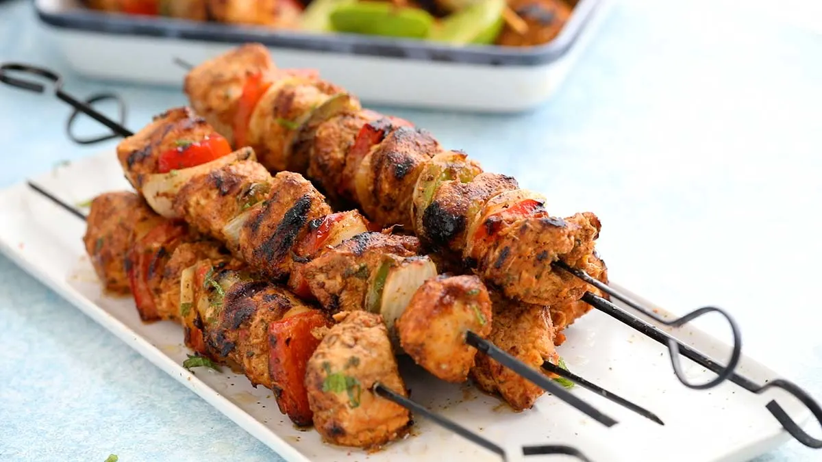 Minced chicken mixed with spices and herbs, skewered and grilled to