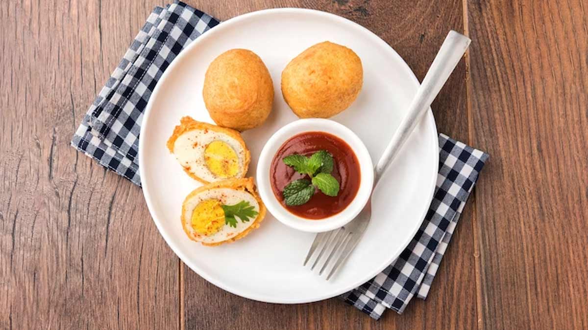 Boiled egg halves dipped in spiced gram flour batter and deep-fried.
