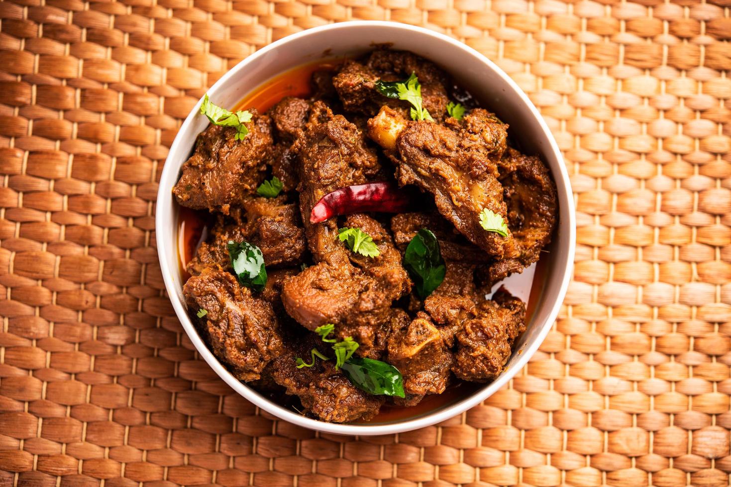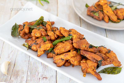 Tender goat pieces stir-fried with black pepper, curry leaves, and spices.
