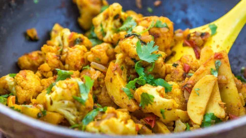 Aloo Gobi is a classic vegetarian dish made with tender potatoes and cauliflower, cooked with