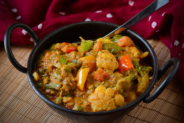 A mix of vegetables in a fiery, tangy style curry.Bold flavors with a spicy kick.