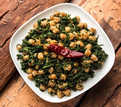 Chickpeas simmered with spinach and mild spices in a flavorful curry.